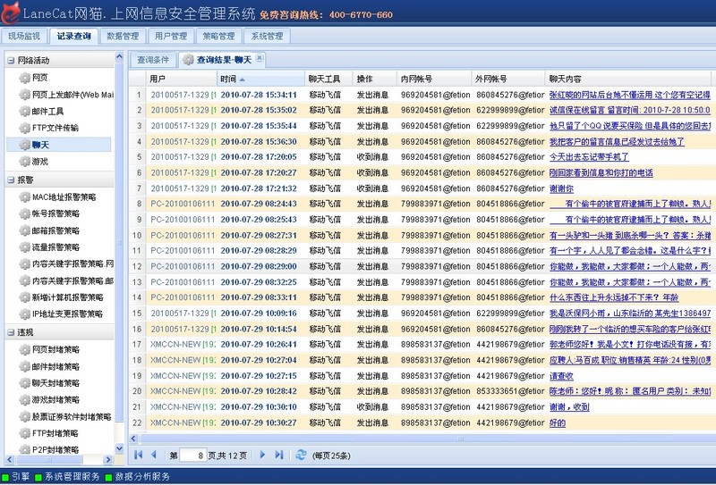 LaneCat网猫可以完整地记录大部分主流即时聊天工具的聊天内容,同时,它还可以阻止用户通过聊天工具外发内部机密文件,从而有效地防止内部机密文件经由聊天工具泄漏。