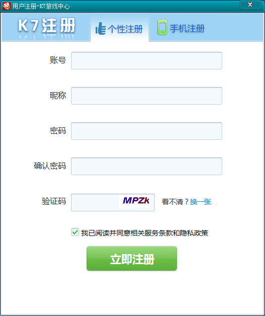 1、下载安装好官方最新版本K7游戏大厅,打开游戏中心,第一次进入需要注册账号。