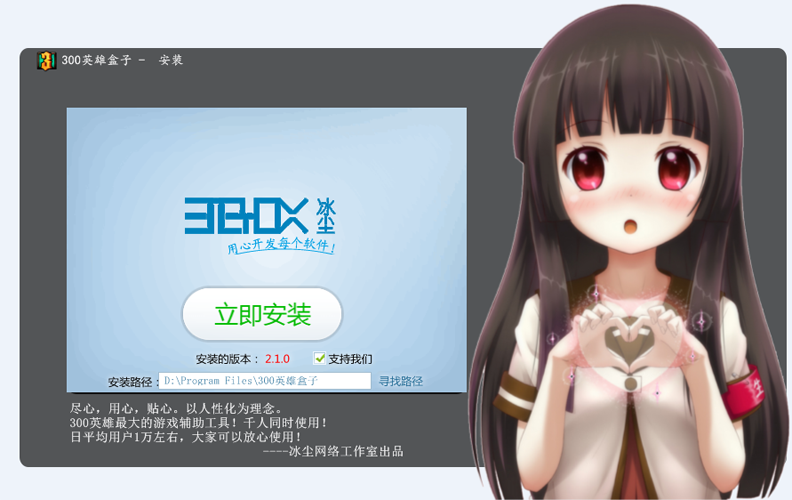 300英雄盒子全新升级,界面不再模仿LOL盒子,更加二次元,更加高大上。新版300英雄盒子全面开启,UI全面升级,新增战绩查询、无线视距、对战信息、游戏优化、游戏多开、一键喊话、游戏资讯、战绩排行榜,次元力,工具插件等。